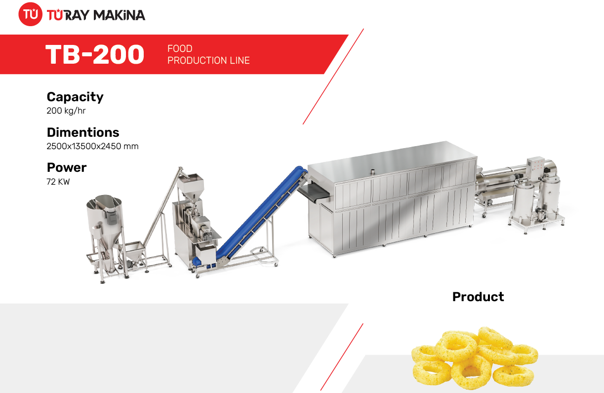 The TB 200 Corn Chips Production Line is the ideal solution for food industry companies, offering high-quality corn chips production with large capacity. The line is designed using excellent materials that suit various environments, ensuring ease of operation and maintenance.